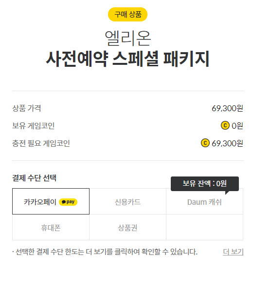 카카오페이, 신용카드, 다음캐쉬, 휴대폰, 상품권이 있는데