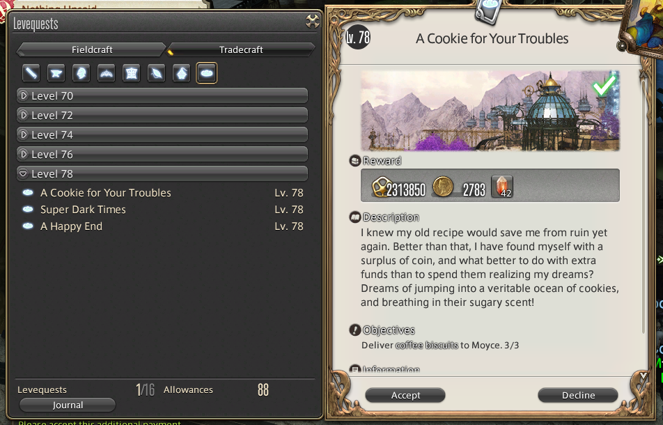 결론은 크리스타리움의 공방에서 받을 수 있는 제작의뢰를 통해서 커피쿠키를 납품하는 것이다.